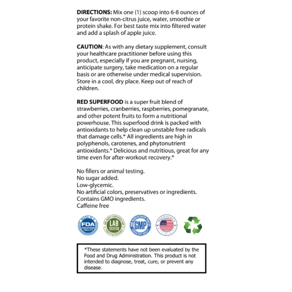 Our product is synthesized utilizing the latest scientific research, formulated with high quality ingredients, and comes in a delicious red superfood flavor!